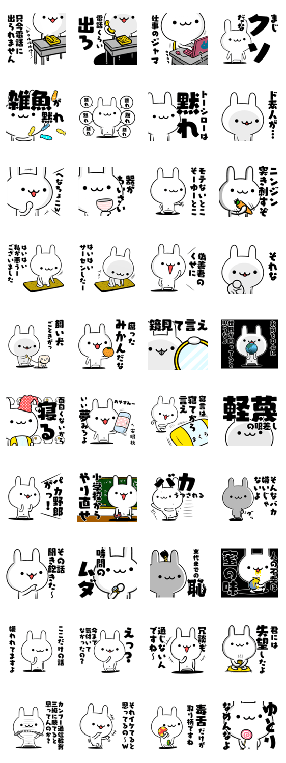 無難に使える定番ウサギスタンプがさらに毒舌で使いやすくなって登場!いつまでも永遠に使用してあげてください。煽り,罵倒,謝罪,忠告,罵り,応援などに愛あるスタンプを♡