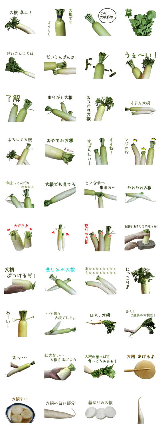 大根の写真で作った実写スタンプです。生でも煮物でも美味しいダイコンをどうぞ。超高画質です。飯テロにも。野菜、だいこん、ベジタブル最高!