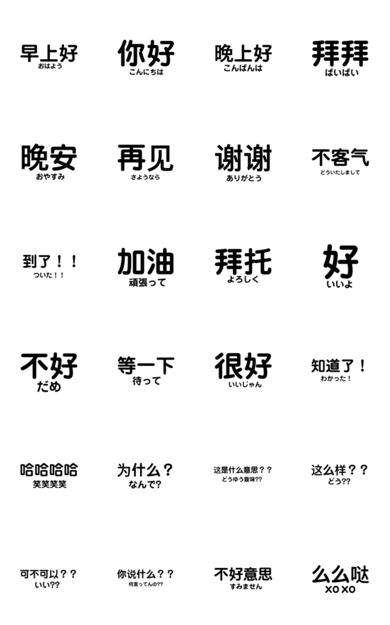 | スタンプ説明 | 日常で使えそうな中国語を集めてみました。日本語訳付きで使いやすくなってます。 |