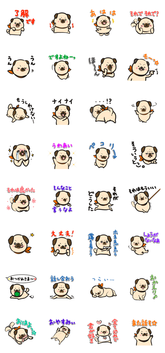 包容力とツッコミの絶妙なバランス。聞き上手なパグ犬のスタンプです。