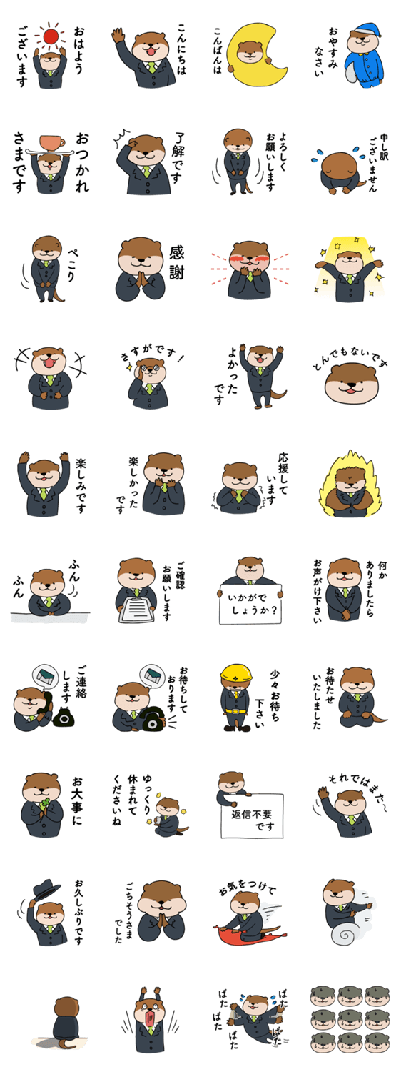 よく使う敬語のフレーズをメインにした、スーツを着たカワウソのスタンプです!先輩や上司の方との連絡やビジネスシーンでご活用いただけます〜◎