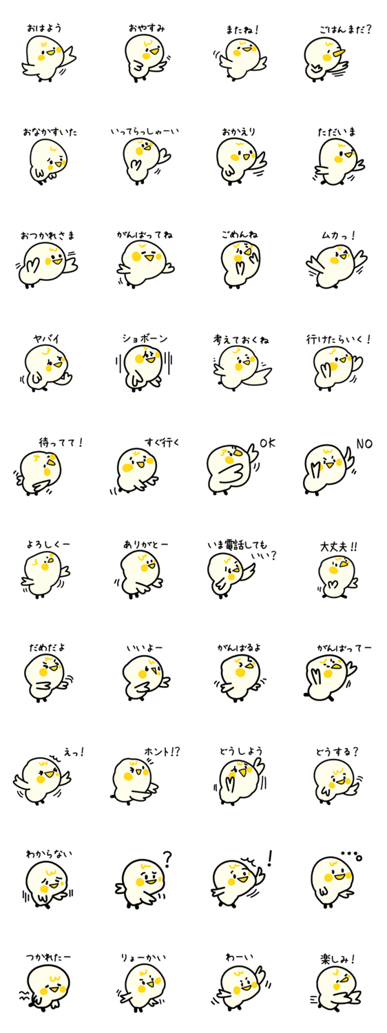 おはよう、大丈夫!いいよー、など日常でよく使う言葉をカワイイひよこがつぶやきます。使いやすいので学校、会社、平日、休日、いつでも送りやすいスタンプになっています