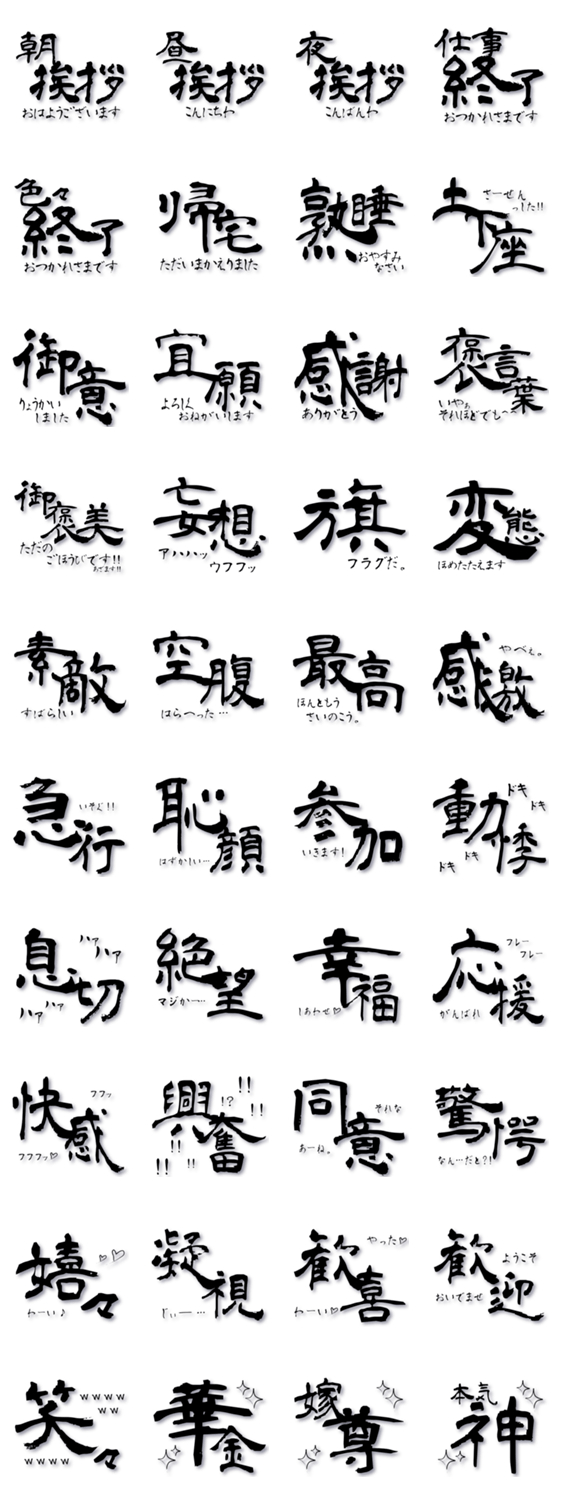 筆文字でインパクトのあるスタンプにしました。言葉や感情を伝えるのに役立てていただけますように!男女年齢問わずお使いいただけるとおもいます。