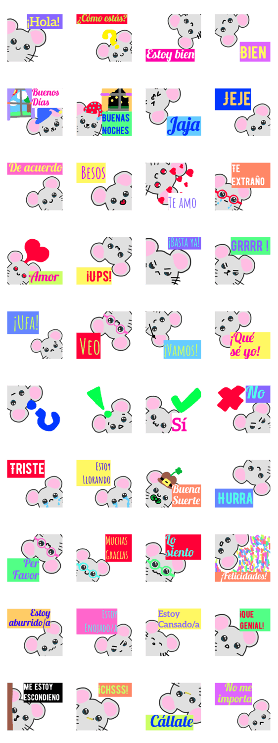 | スタンプ説明 | The little grey mouse speaks Spanish. He uses basic phrases to communicate. He is very cute and has lots of emotions. Use it in chats with friends and family |