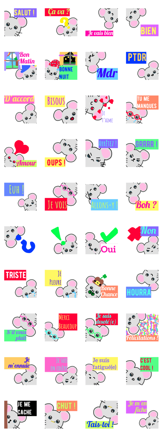 | スタンプ説明 | The little grey mouse speaks French. He uses basic phrases to communicate. He is very cute and has lots of emotions. Use it in chats with friends and family |