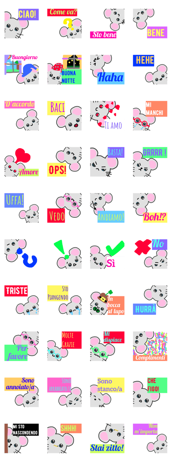 | スタンプ説明 | The little grey mouse speaks Italian. He uses basic phrases to communicate. He is very cute and has lots of emotions. Use it in chats with friends and family |
