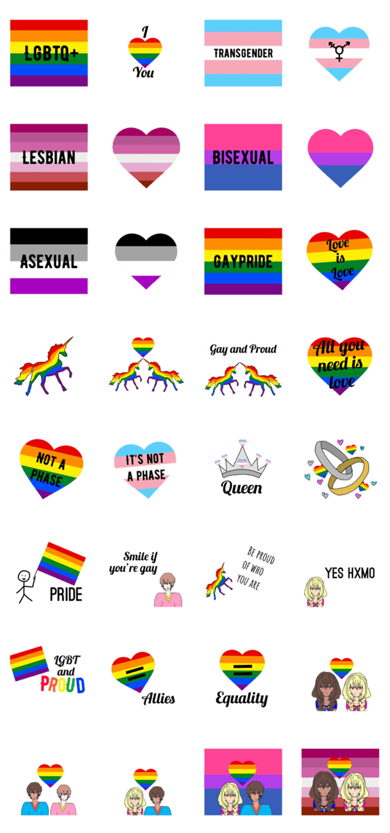 | スタンプ説明 | Stickers for LGBTQ+ people, supporters, and friends. Includes flags for gay, lesbian, transgender, asexual, and some cute couples and phrases. Also a unicorn |