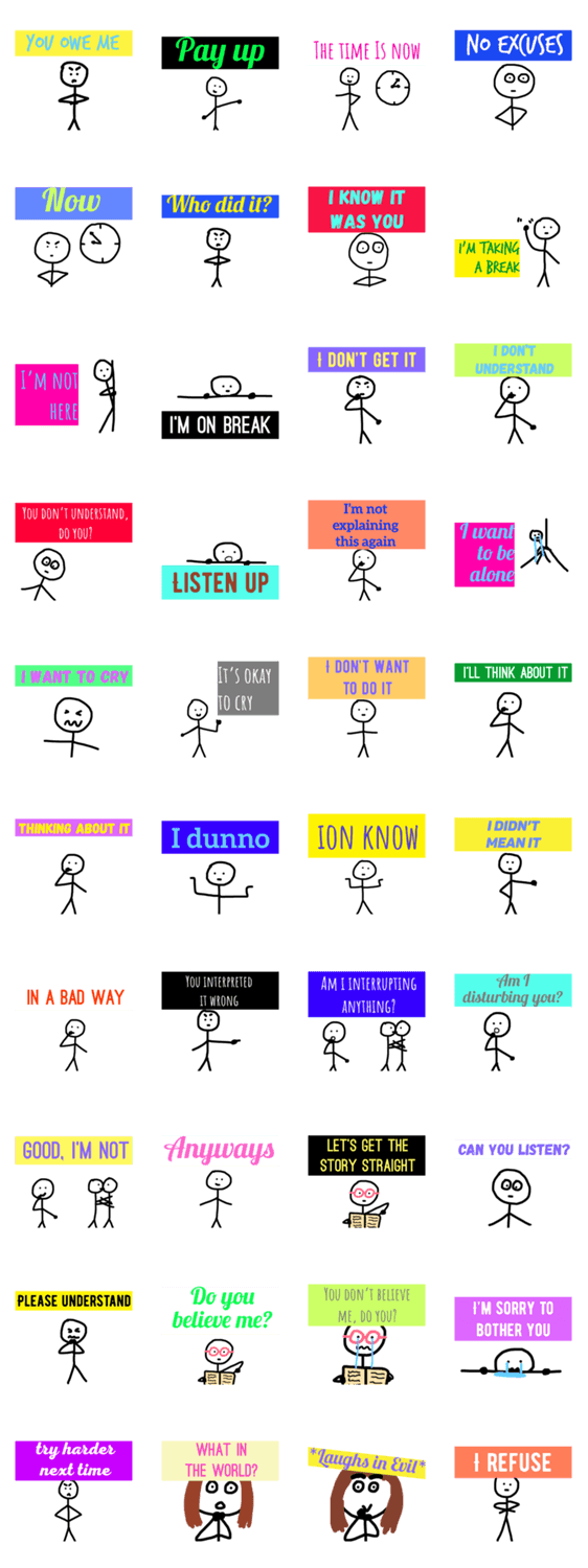 | スタンプ説明 | The sticker of boy and girl. For refusal, questioning, getting the story straight, and resolving problems. They are happy and forgive each other in the end |