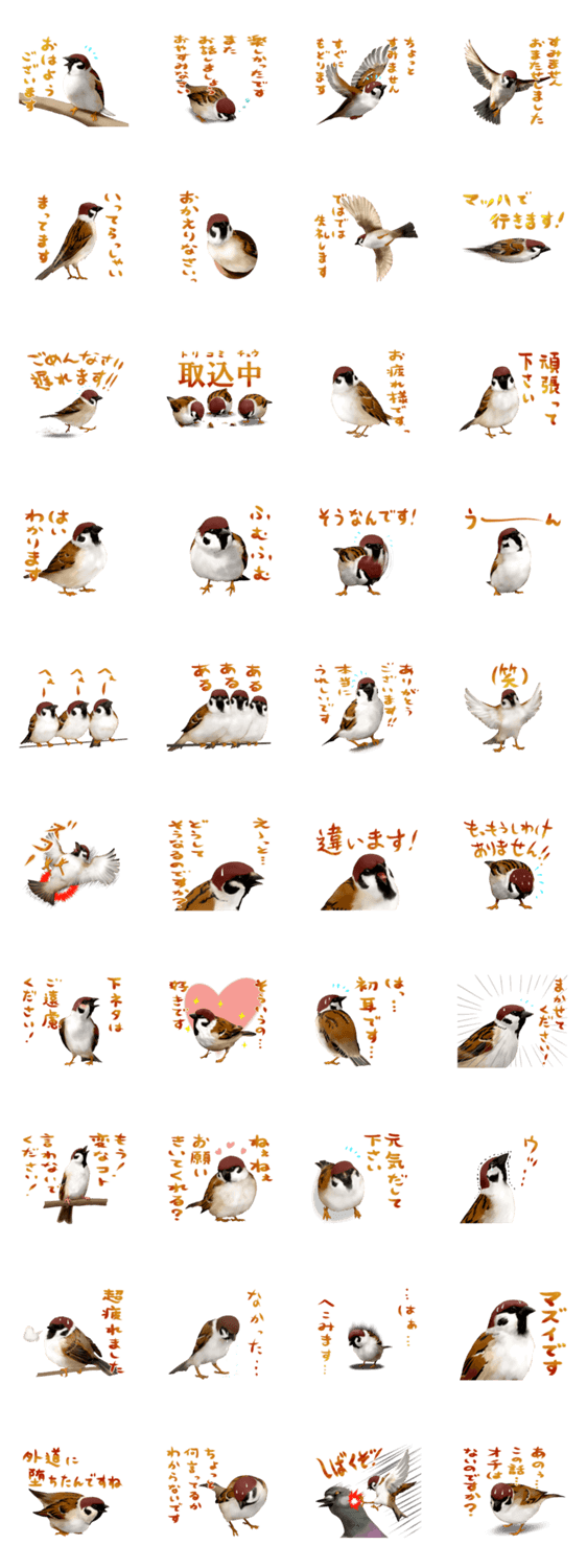 いつもひかえめなスズメちゃんのスタンプです。気が小さくてシャイだけど、今日も健気にがんばります。
