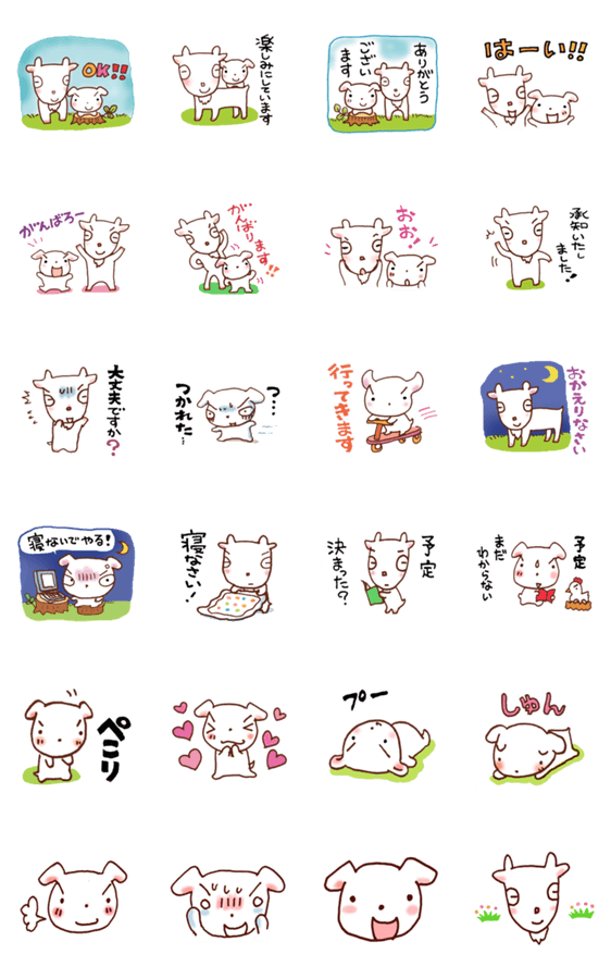 ヤギのメーメーとイヌのがんばりやちゃんの日常会話スタンプ