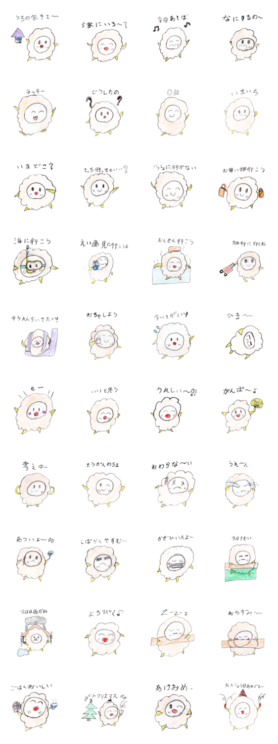 | スタンプ説明 | 小学生のお絵かきから生まれた丸っこいヒツジのまるちゃんです。 |