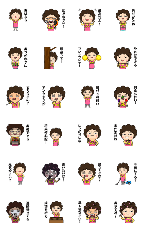 鬼嫁(おによめ)が、同居中の家族、一人暮らしの娘息子や単身赴任の夫に向けて、熱いビデオレターを送ります。母と家族の愛情と絆を深める為のスタンプです。