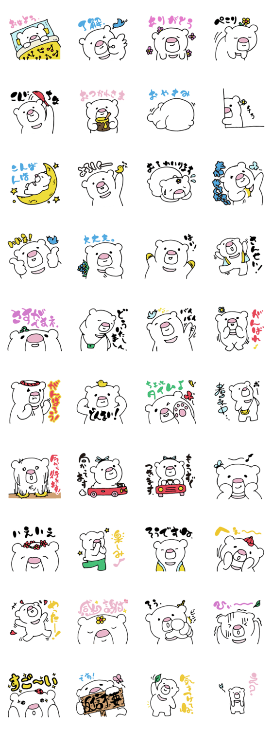 毎日使えるスタンプ。ほのぼのして可愛い白いツキノワグマの「シロボノさん」です。よく使うリアクションで作りました。あどけない表情の白いクマに癒やされてください^^