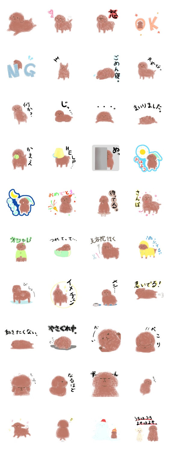 ちょっぴり目つきがわるい米俵体型のプードル、プー子さんのスタンプです。