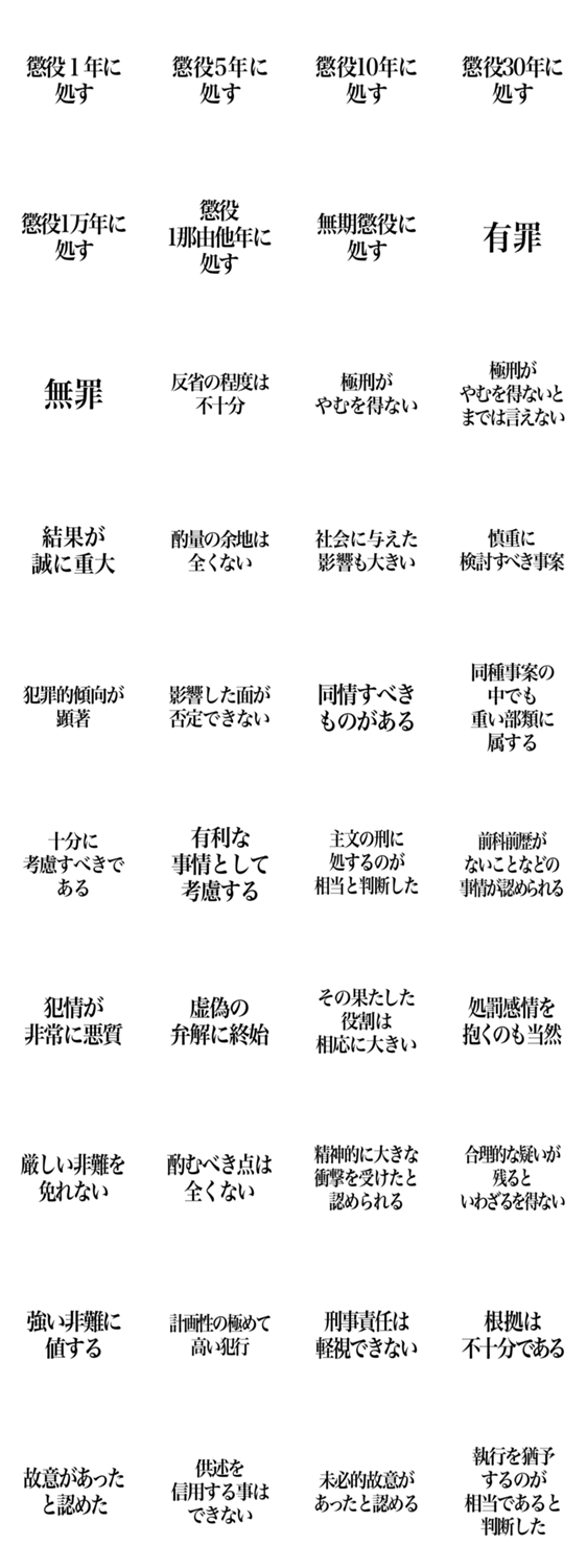 「懲役刑に処す」などの裁判の判決文に意外と使える言葉をスタンプにしました。非難する時、法学部や法曹・法律関係者の日常会話などに。