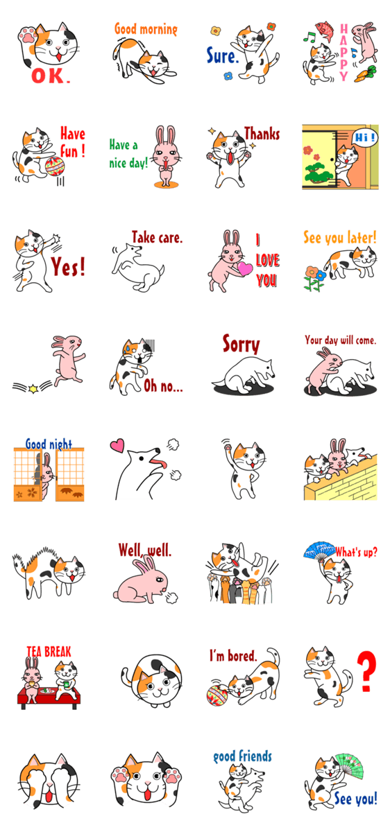 下町のアイドル三毛猫「ぬにょ猫。」の英語バージョンスタンプ! 今日もから犬、たま兎と戯れています。 日常のやりとりに登場させてネ!