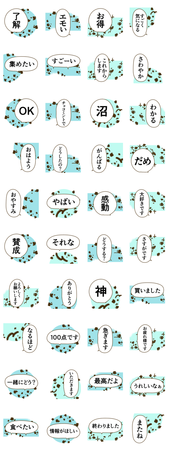 チョコミントが好きな人、子供も若者も大人も使えるスタンプ。アイス、味、色、流行が好き。シンプルと吹き出し(ふきだし)毎日使える言葉/基本。3。ナチュラル