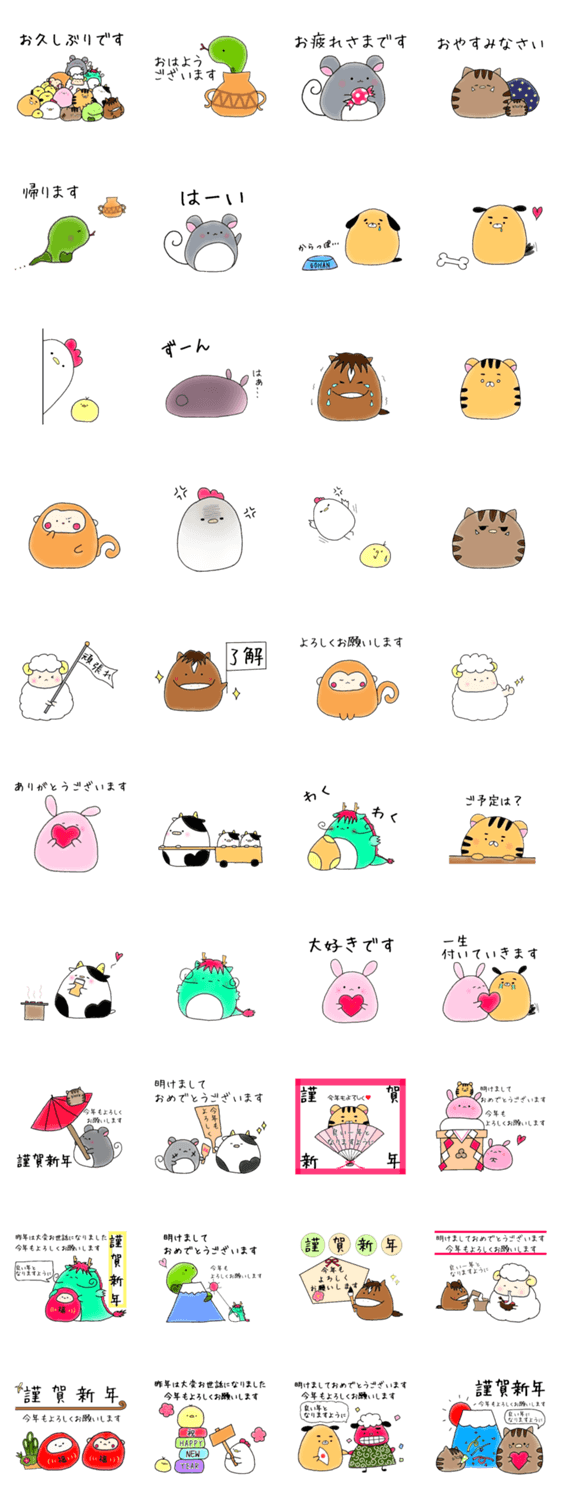普段使いができ、さらに年始の挨拶が永遠に使える!お得な、十二支たちのスタンプです。