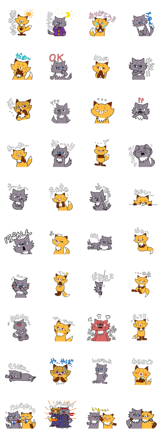 いろんな表情を見せる少々生意気な狼と狐のスタンプ。普段悪者扱いされるが、本当はいい奴ら。