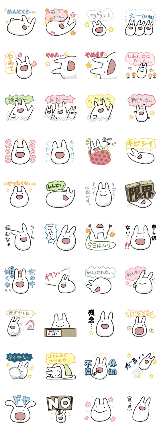 うさぎになりたいたましいのスタンプです。ネガティヴな感情を笑顔で吐き出したいときにどうぞ。