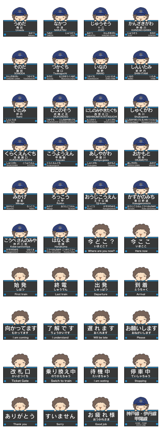 | スタンプ説明 | ぱんちくんが阪急の神戸線・伊丹線・甲陽線(梅田駅、中津駅、十三駅、塚口駅、伊丹駅、西宮北口駅、夙川駅、甲陽園駅、芦屋川駅、神戸三宮駅 )をアナウンスしています。 |