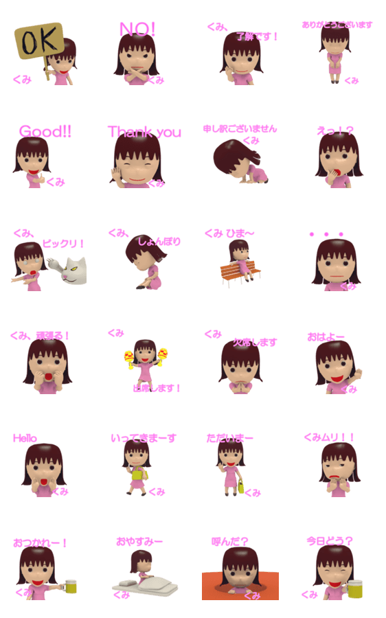 | スタンプ説明 | くみさん用の女の子スタンプを3Dで作ってみました。全国の久美さん、ぜひ使ってください! |