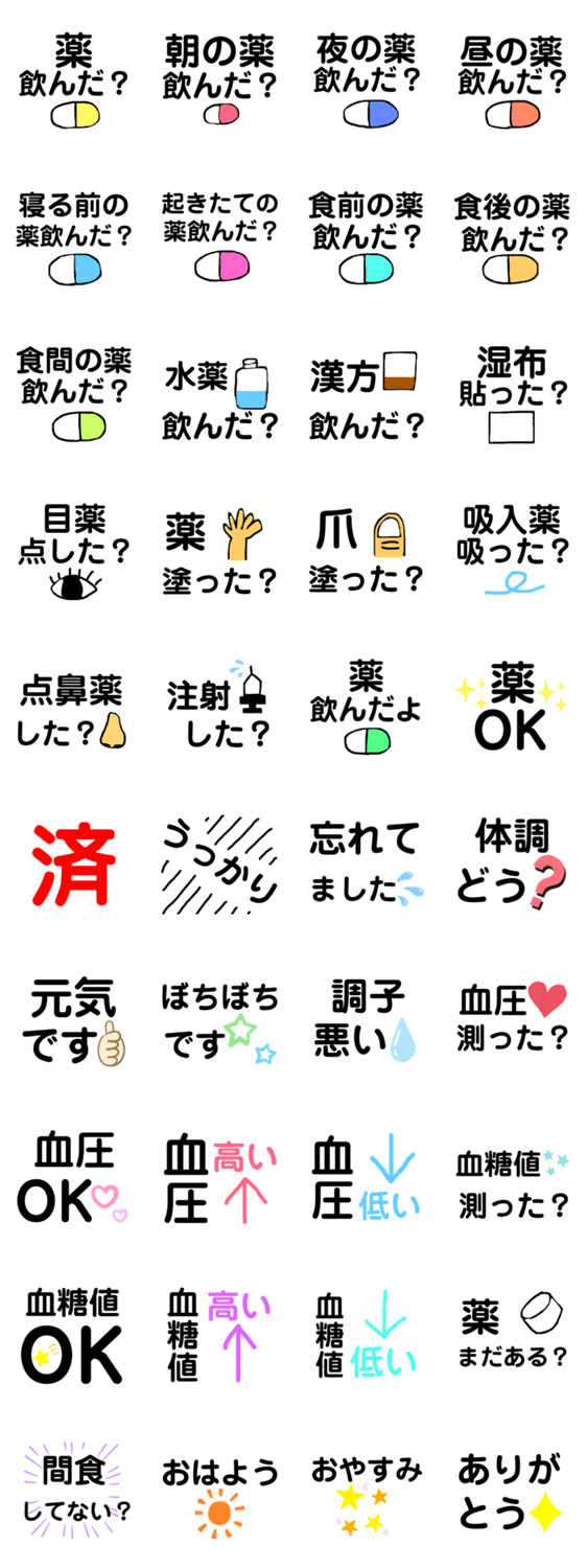 薬の心配を解決するスタンプです。患者さんのご希望で作りました。スタンプを送るだけで、安心してご家族の健康を見守れます。デカ文字で毎日使いやすいです。