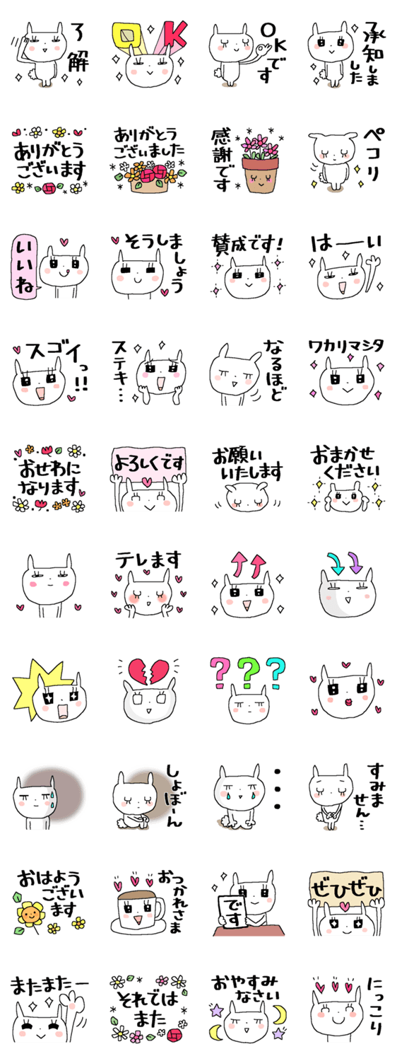 見やすさ重視のシンプルなイラストと大きな文字。大人カワイイうさ子の毎日使える40個。素直な気持ちが伝わるスタンプです。