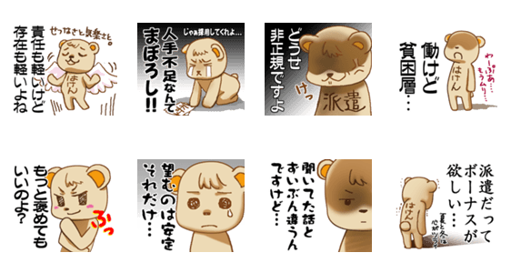 ボーナスが欲しい、退職金が欲しい、待遇格差を何とかして欲しい…など。派遣で働く『くま』の卑屈なつぶやきのスタンプです。