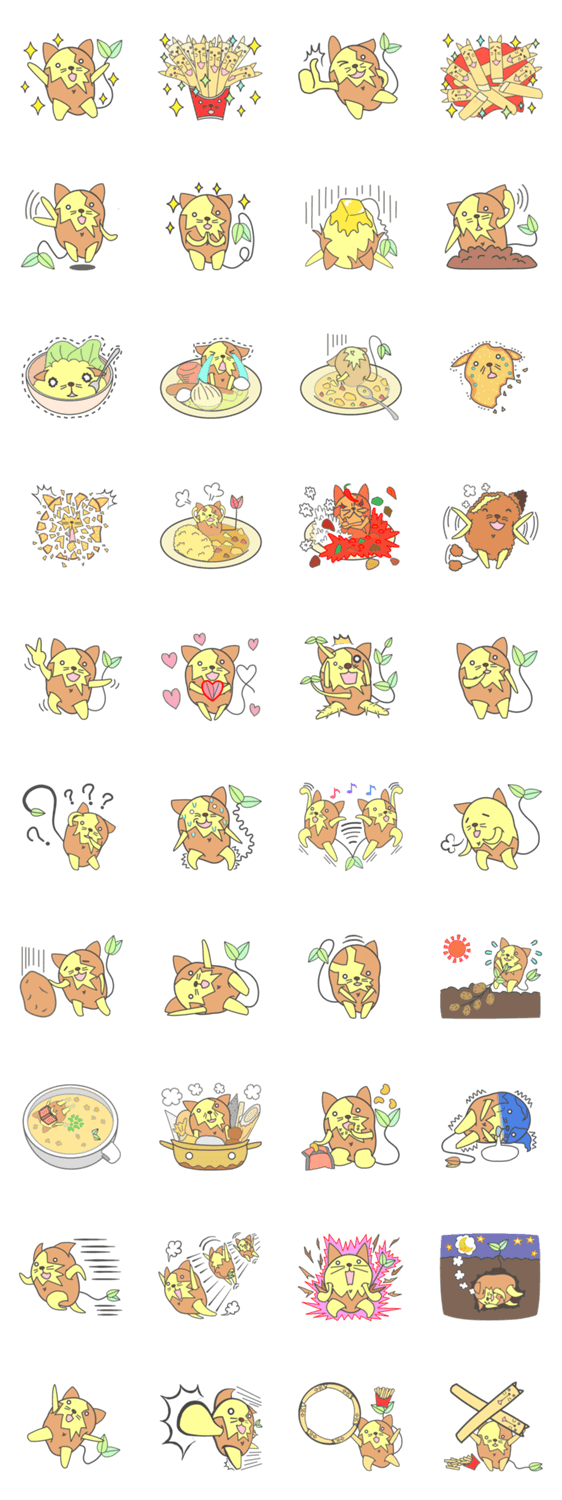 ジャガイモ猫のじゃがねこスタンプです。はしゃいだり、へこんだり、料理されたり、ぼーとしたりのカワイイキャラクターです。