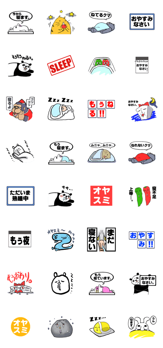 夜 一日の最後に使えるスタンプが、シンプルからちょっとヘンテコなのまで たくさん♪