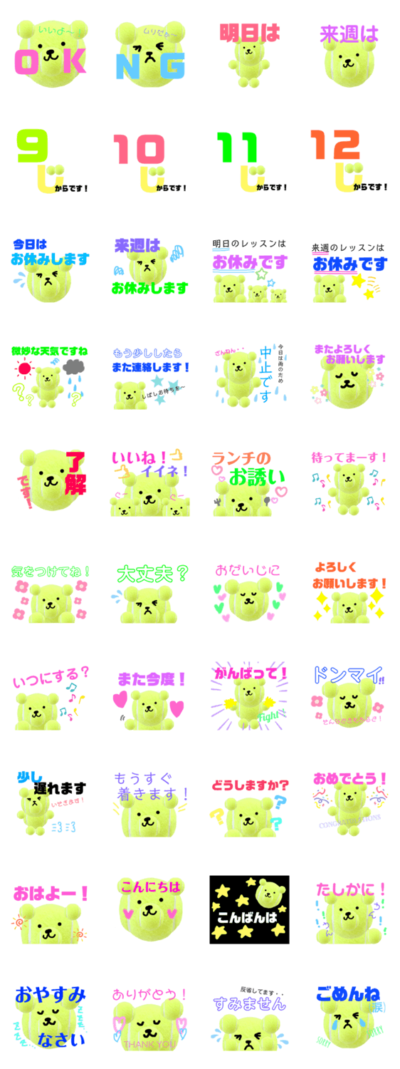 テニスボールでできたかわいいクマちゃんのスタンプです。部活やレッスンなどテニス仲間との会話が盛り上がること間違いなし!普段使えるあいさつ等も揃えました。