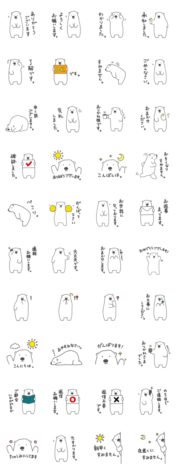 | スタンプ説明 | シンプルで使いやすいしろくまさんの敬語スタンプです。 普段使いはもちろん、ビジネスやママ友とのやりとりにも向いています。文字は大きめで見やすくなっています。 |