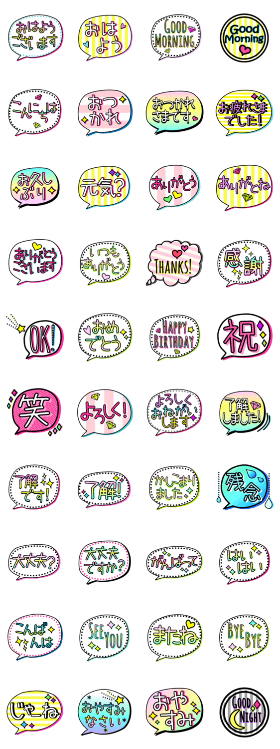 大きくて見やすい毎日良く使う言葉!吹き出しタイプのカラフルでかわいいスタンプです♪敬語からタメ語まで!いろいろごちゃまぜ40パターン♪