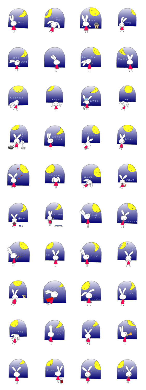 | スタンプ説明 | うさこの友達は優しいお月さま。うさこのいろんな気持ちを、お月さまはいつも優しく見つめてくれています。 |