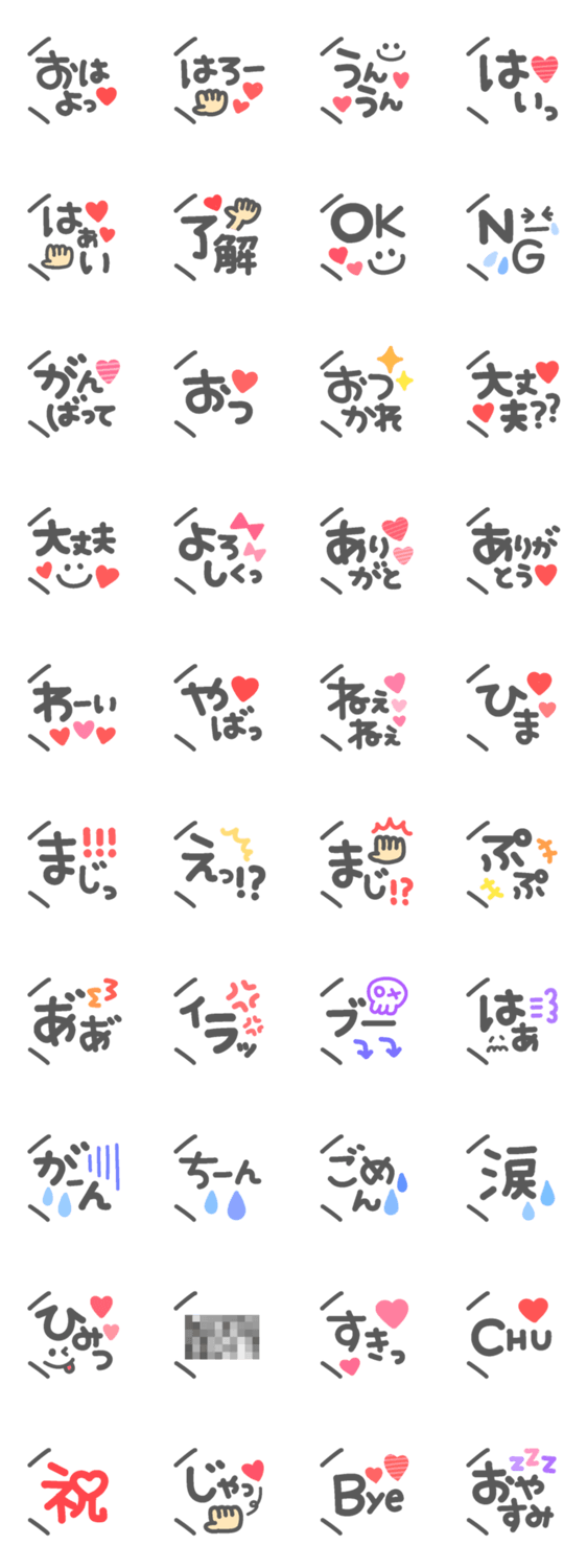 ゆるかわいい吹き出しスタンプです♪日常でよく使う言葉を集めました♪ハート多めで縁取り無しです。