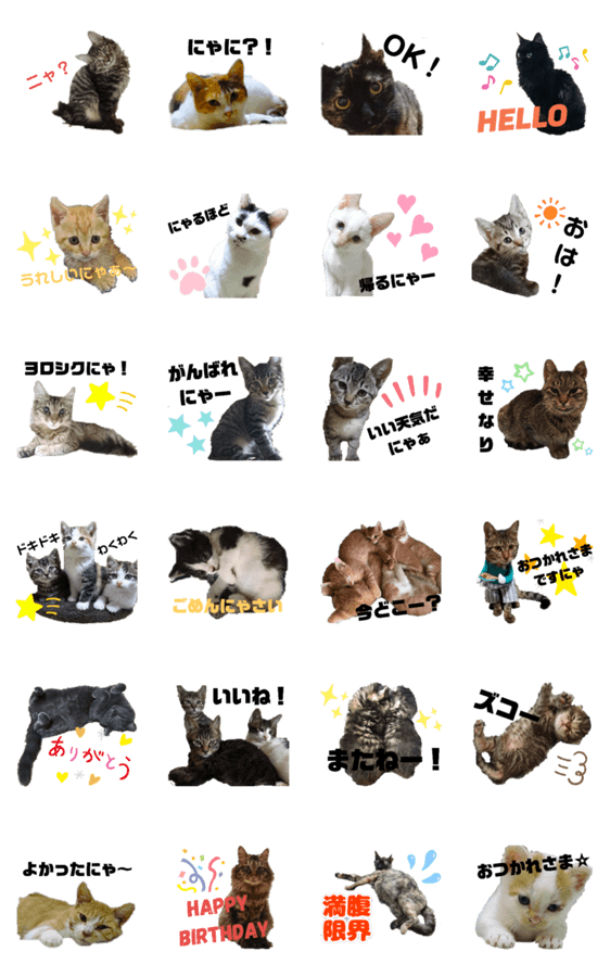 | スタンプ説明 | 様々な生い立ちを経てツキネコせたな支部に保護された幸せにゃんこたち第一段☆ |
