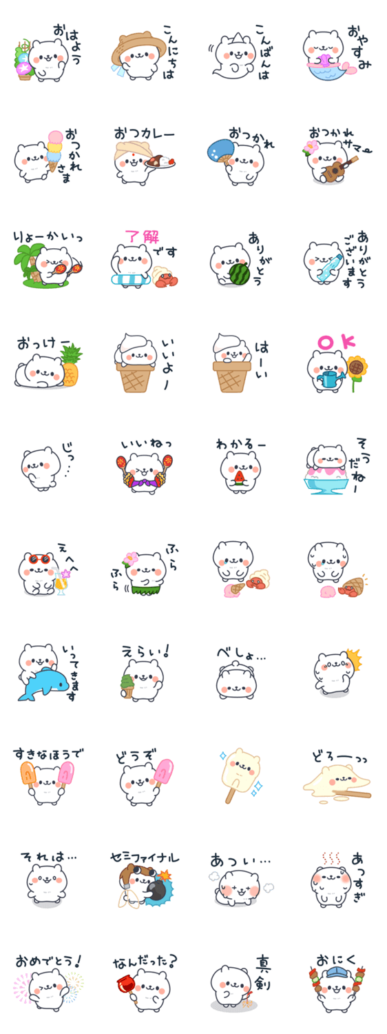 夏らしい小物がいっぱい♪挨拶やお返事に使いやすい、ちょっとお茶目なしろくまのスタンプです。