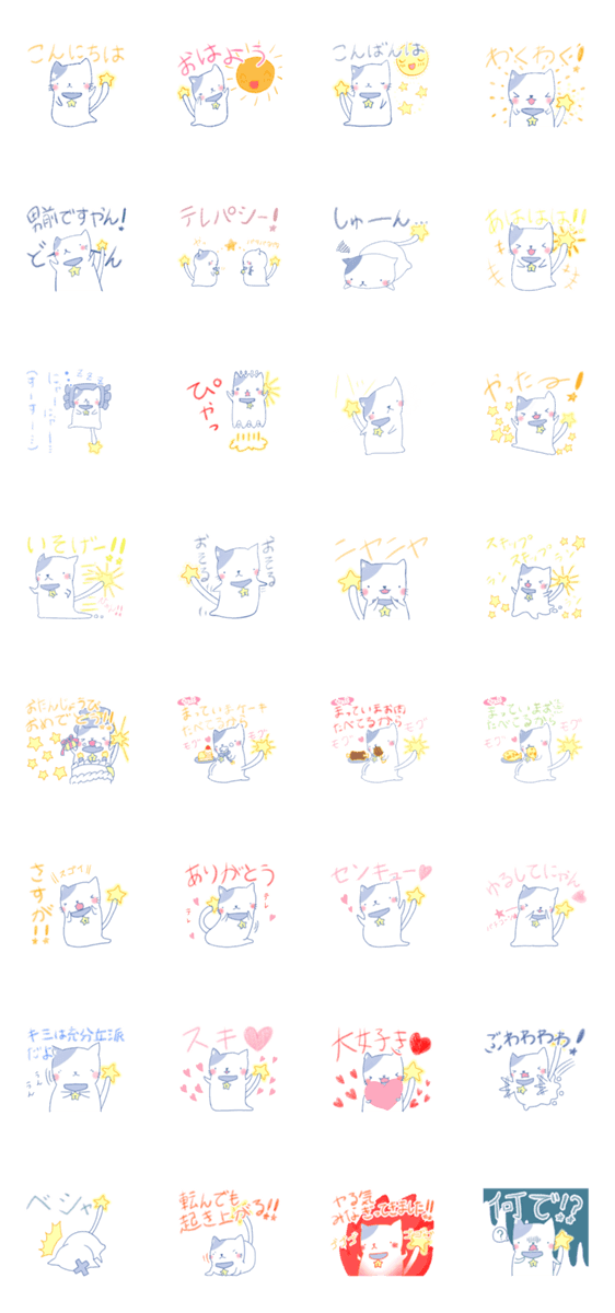| スタンプ説明 | わくわくすることを見つけるのが大好きな感情表現豊かなにゃんこ、それがすたぁにゃんこ。わくわくした気持ちで描きました。ぜひ使ってください。 |