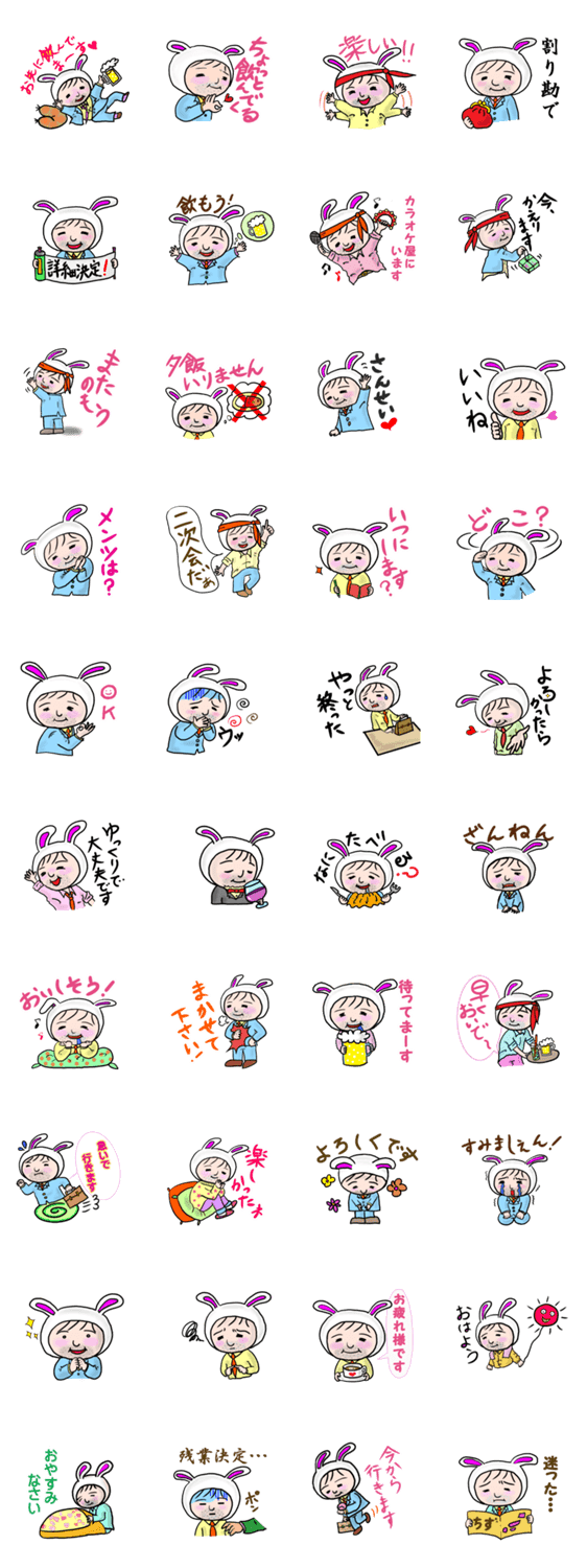 うさぎのサラリーマン、うさぎ田さんの可愛い飲み会スタンプです。飲み会をしたいと思ったら、ぜひ使って下さいね。
