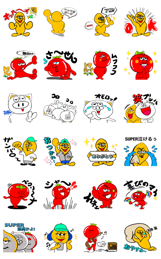 | スタンプ説明 | ライス、トマティー、トマティーナ、ボビーの ゆるっとLIFE スタンプ! |