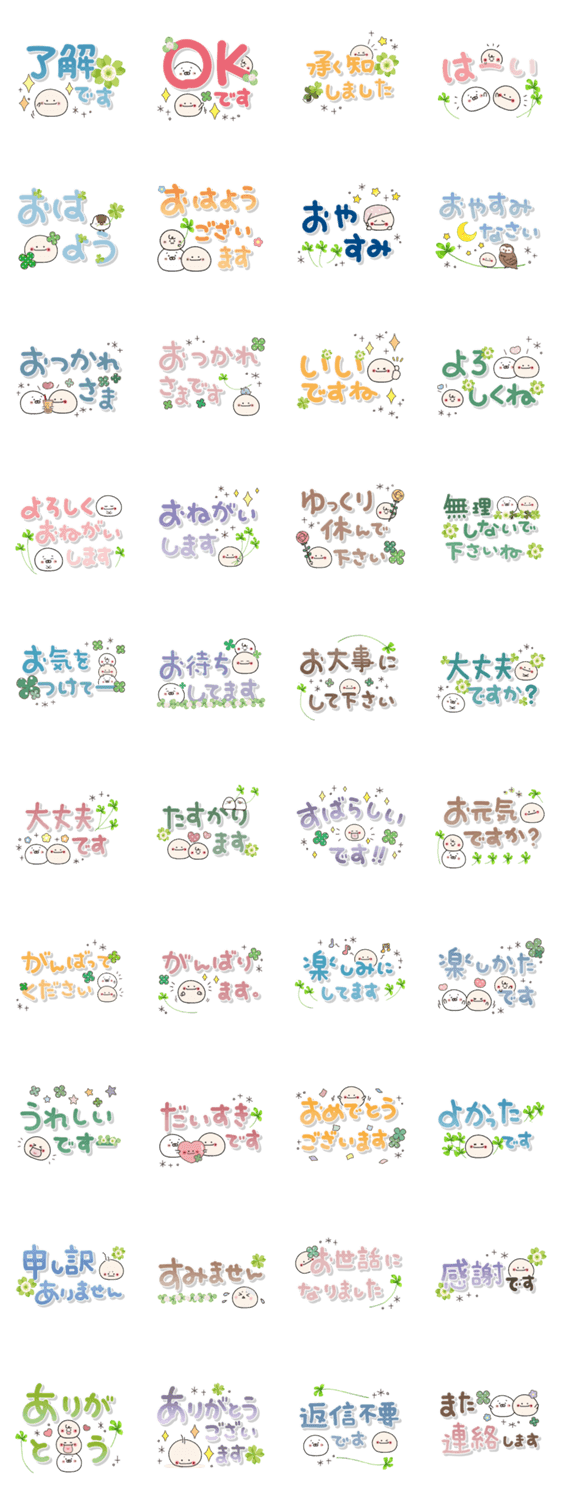 大きめ文字で読みやすい、敬語多めの毎日使えるスタンプです。やさしい言葉、気遣い、思いやりの言葉が詰まっています。クローバーが大人かわいい雰囲気です♪
