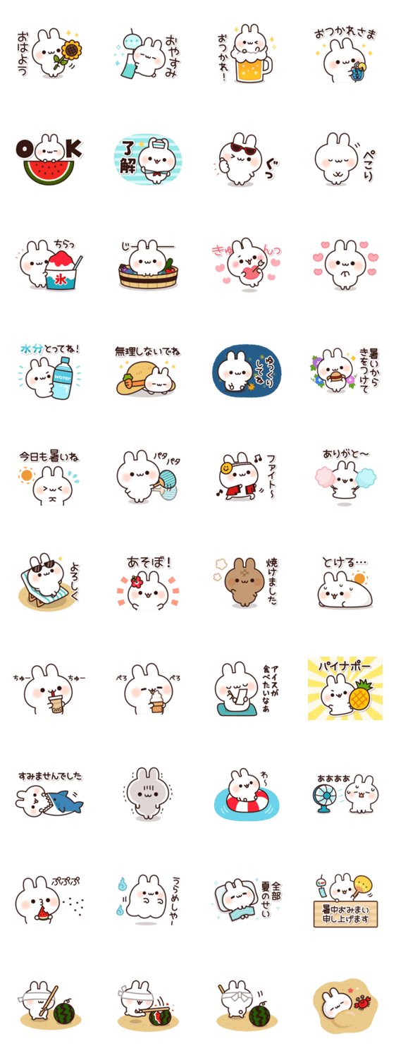 ゆるっとかわいい白ウサギさんが夏を満喫しているスタンプです♪日常系や気づかい系など、誰にでも使えて便利です!