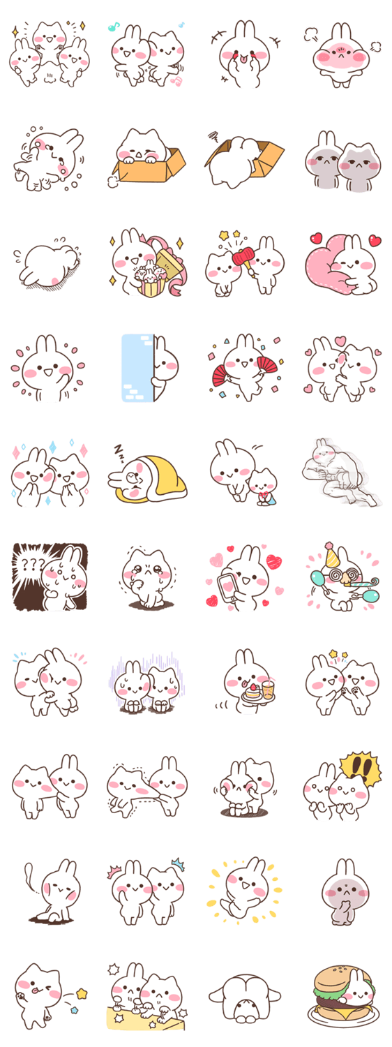 おしりがチャームポイントのうさぎ&ネコの愉快なスタンプです。言葉無しだからこそ、いろんな場面に使えるかも?