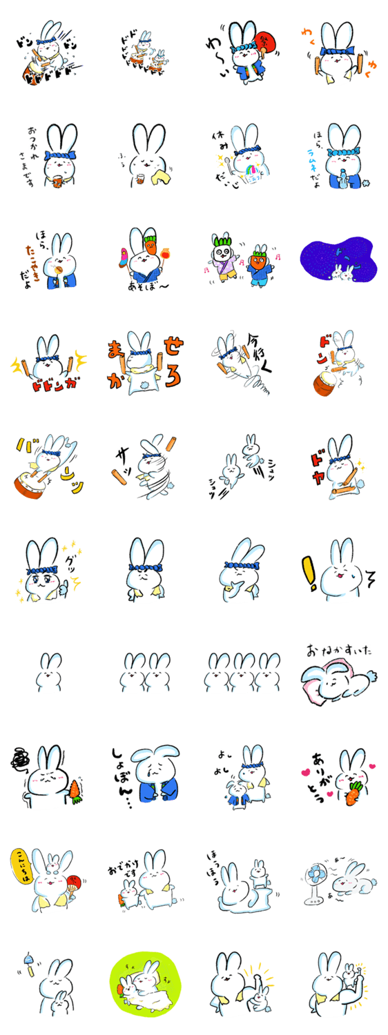 | スタンプ説明 | お祭りがだいすきなうさぎの親子をスタンプにしました。 どこかから太鼓の音が聴こえたら、それはうさぎたちの音色かも? ドンドンドンドンドドドドドドドド・・・ |