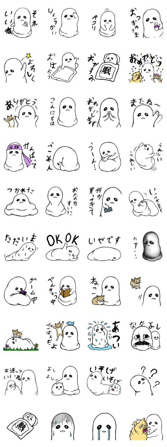 黒目がちでモチモチのバケモノと、その友達(豚、猫など)のスタンプです。