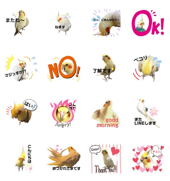 「チュンチュンピアノ、ピアノちゃーん」と歌う、表情豊かなオカメインコのピアノちゃんスタンプです。