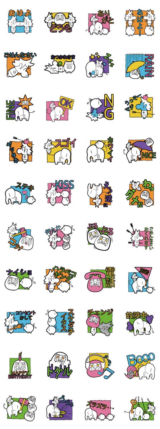 | スタンプ説明 | 話題のしっぽのプラグを持つぞうさんの童謡『そうじきゾウさん』の世界観をLINEスタンプで再現。童謡作家やなせ氏本人によるLINEスタンプ用の書き下ろしイラスト。 |