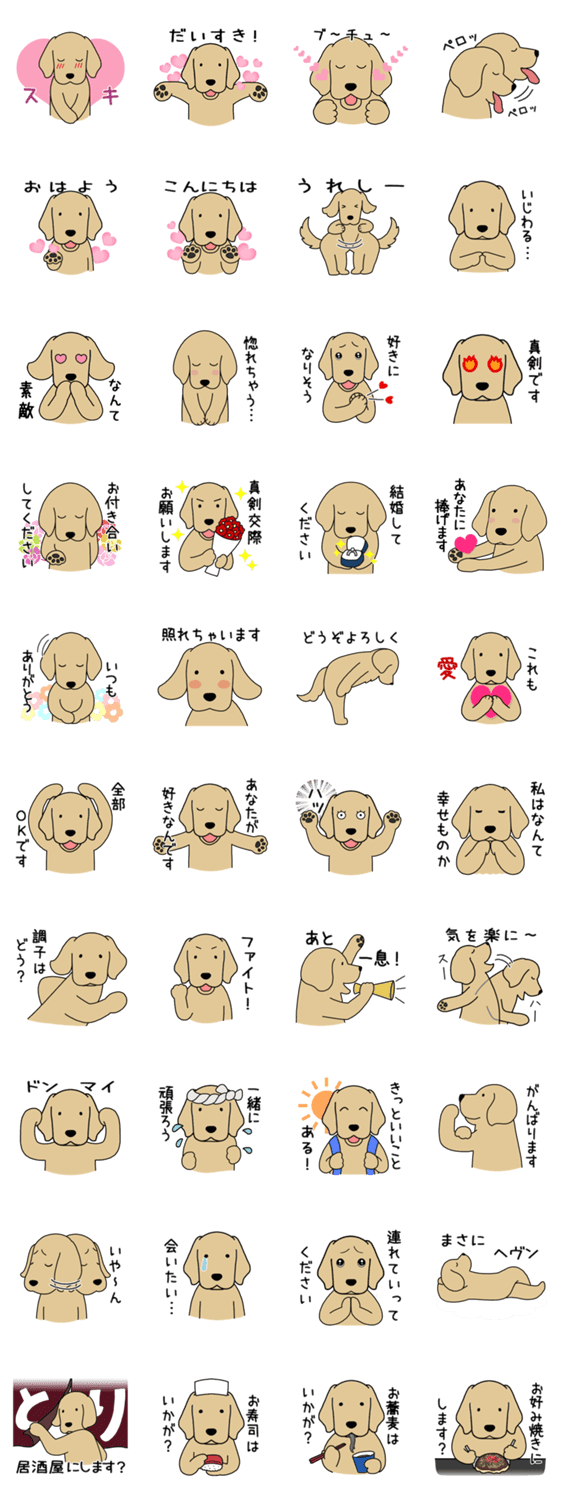 ゴールデンレトリバーのスタンプ第7弾(愛があふれる編)です。愛情表現たっぷりのスタンプです。大きな子犬はさらに成長してお年頃になりました。