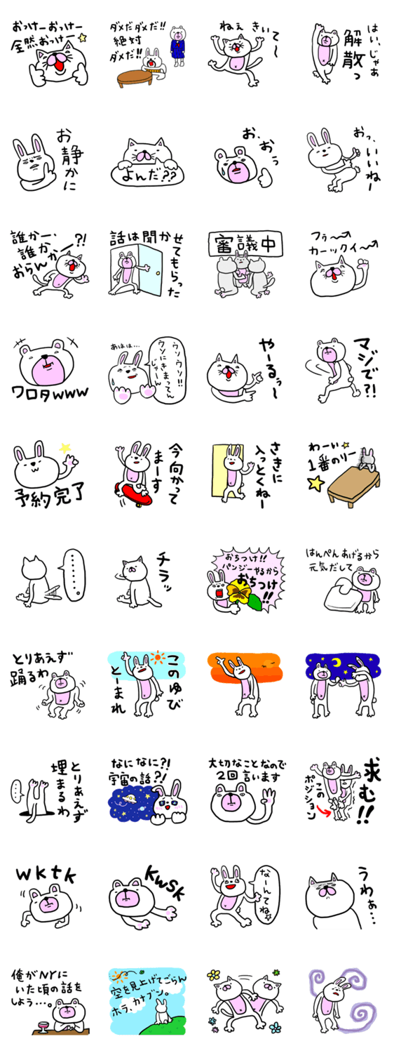 ファニーでキュートなウサギ&クマ&ネコのスタンプです。グループトークにも使えて便利です。